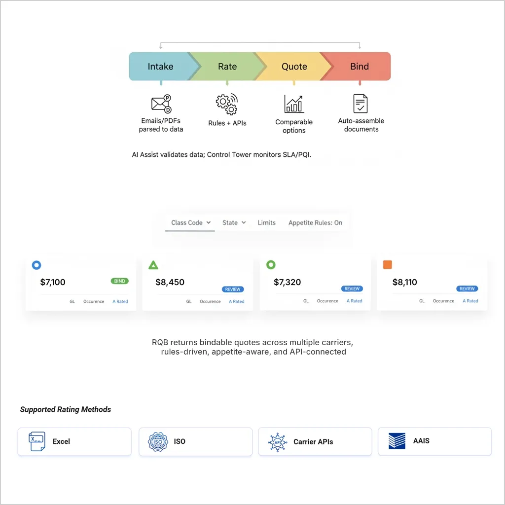Your quoting experience is your first impression. RQB lets you configure rating, carrier appetite, and submissions-all from one platform. It supports multi-carrier quoting, underwriting rules, and API-ready integrations designed for MGA speed.
